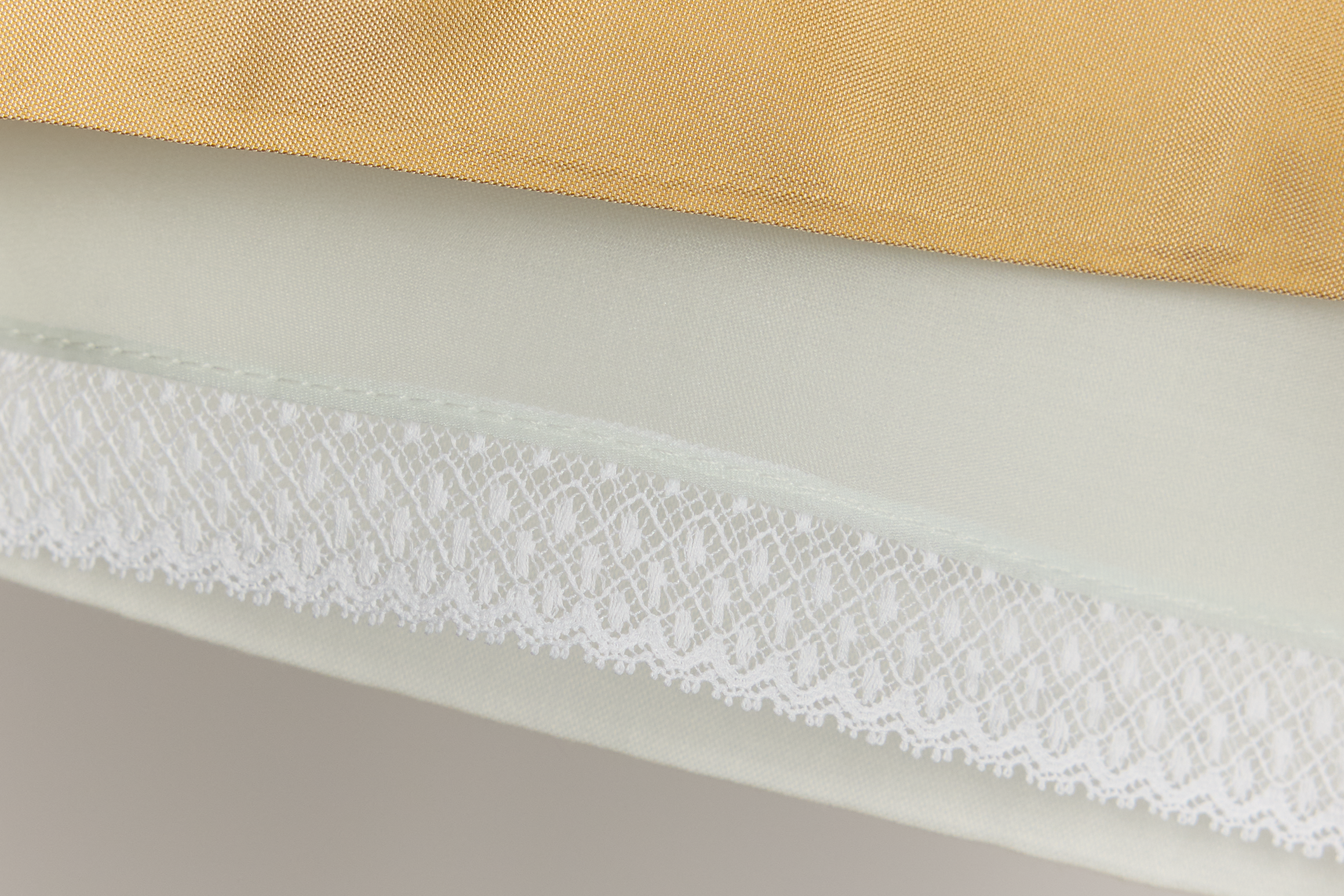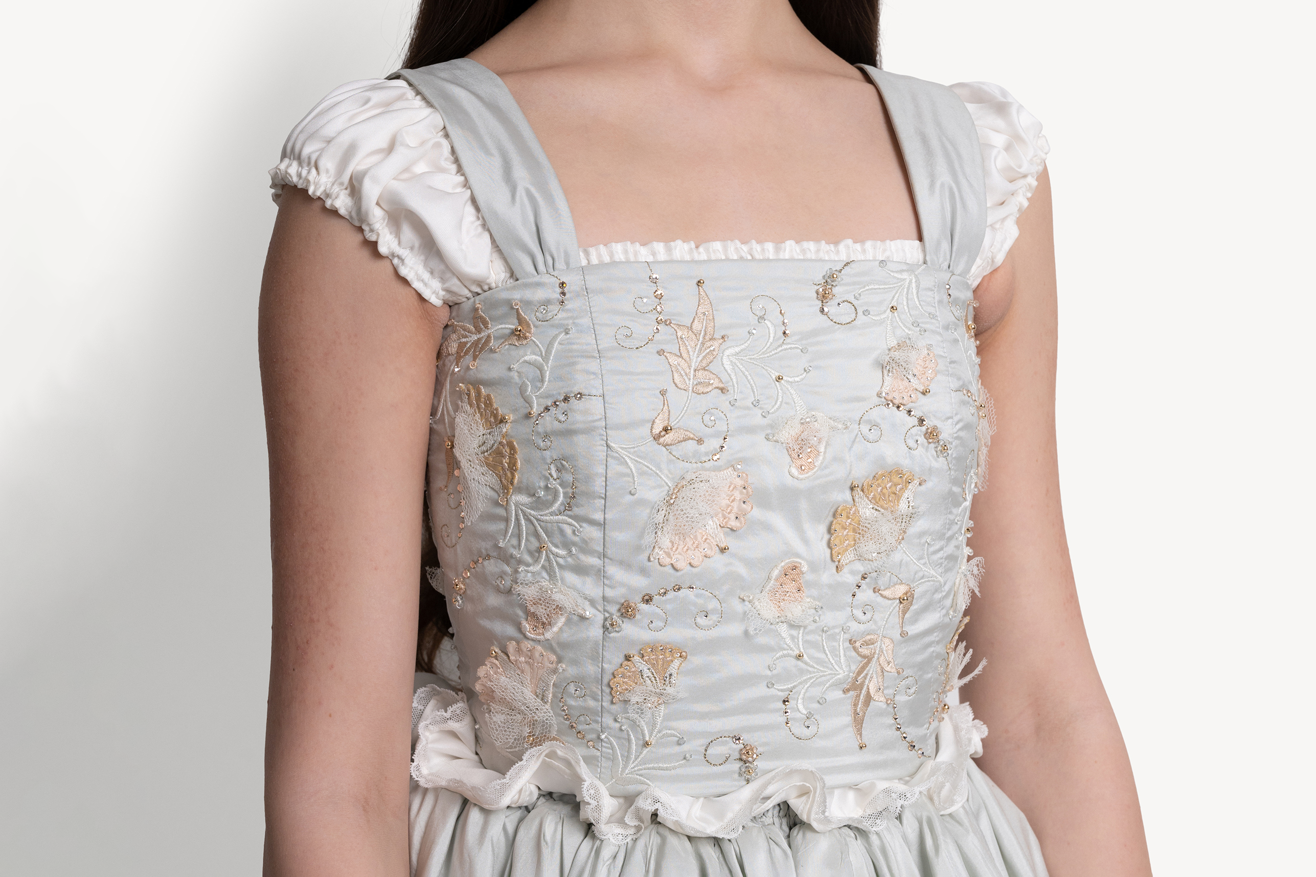 Each Mourènne creation is adorned with exquisite and unique touches, such as intricate lace details, hand-gathered ruffles, hand-pleated ruffles, pin tucks, and our signature adjustable polonaise detail. All of our embroidery, beading, and appliqué is meticulously hand-crafted in-house. The appliqué that dances across our Made to Order bodices is stitched onto our exclusively dyed silk taffeta and accented with the finest beads, crystals, pearls, and French tulle, adding a whimsical touch.