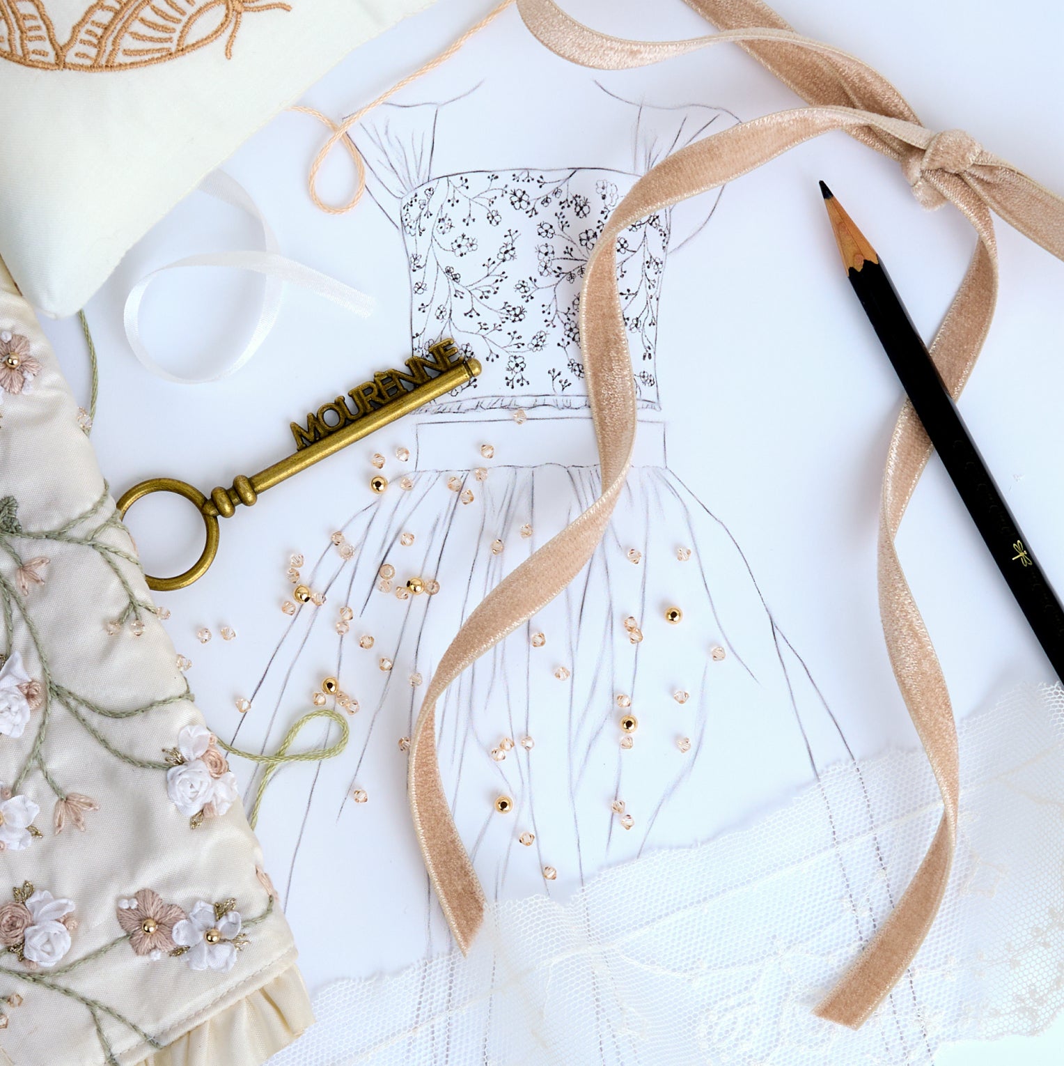 You will have the opportunity to choose from our exclusively made silk patterns and colors, as well as our collection of heirloom French and English lace, exquisite French tulles, and high-end Japanese trims.